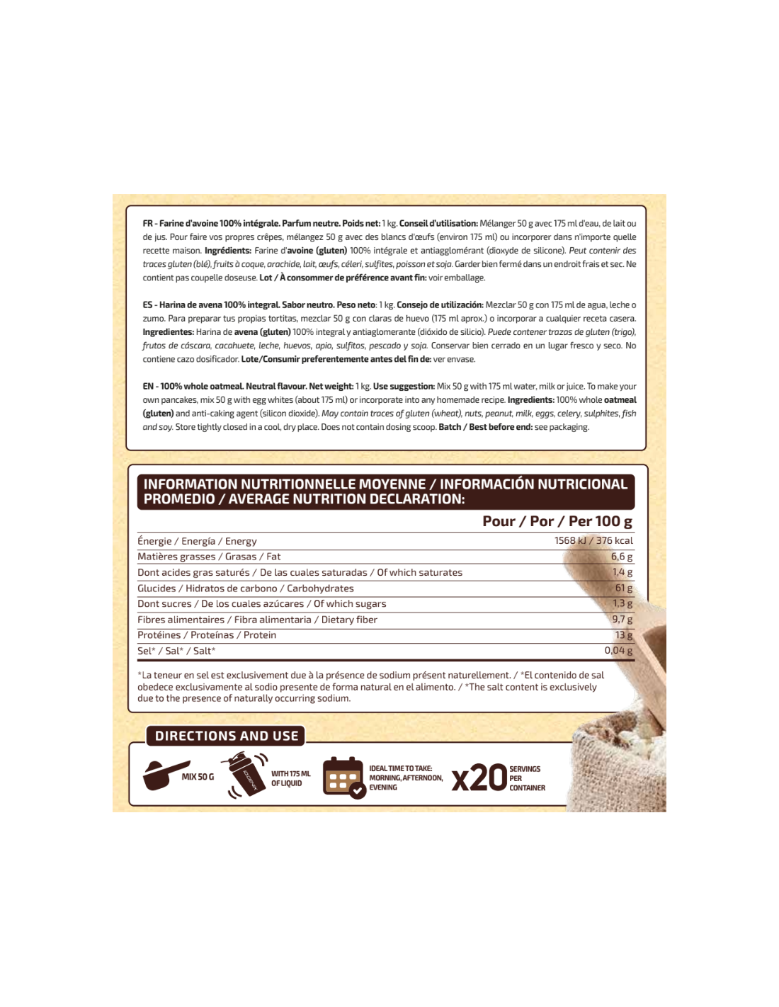 Consejo de utilización: Mezclar con proteína en un batido en el desayuno, mezclar con clara de huevo para hacer tortitas o incorporar a cualquier receta casera.