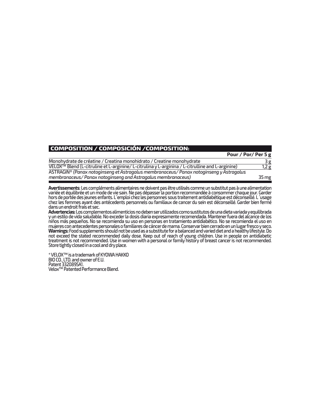 Se trata de un complemento alimenticio ideal para mejorar el rendimiento físico durante los entrenamientos gracias a uno de sus ingredientes como es la creatina monohidrato junto a Velox™ una patente a base de L-citrulina y L-arginina.