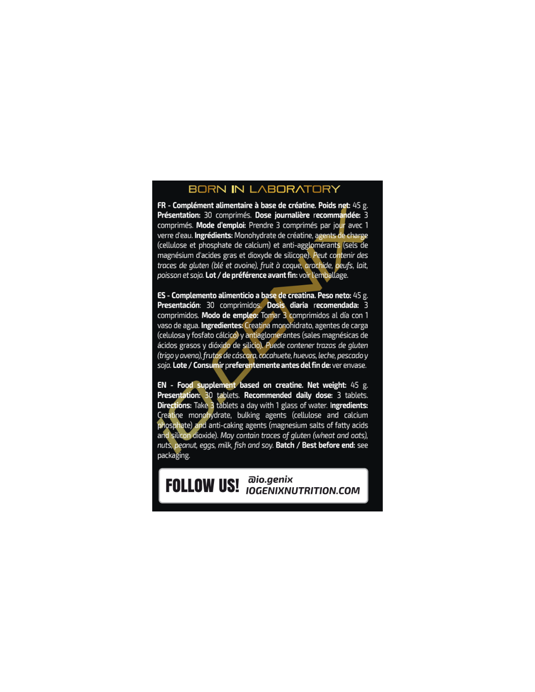 Complemento alimenticio a base de creatina. Peso neto: 45 g. Presentación: 30 comprimidos. Dosis diaria recomendada: 3 comprimidos. Modo de empleo: Tomar 3 comprimidos al día con 1 vaso de agua. Ingredientes: Creatina monohidrato, agentes de carga (celulosa y fosfato cálcico) y antiaglomerantes (sales magnésicas de ácidos grasos y dióxido de silicio). Puede contener trazas de gluten (trigo y avena), frutos de cáscara, cacahuete, huevos, leche, pescado, sulfitos y soja. Lote / Consumir preferentemente antes del fin de: ver envase. Advertencias: Los complementos alimenticios no deben ser utilizados como sustitutos de una dieta variada y equilibrada y un estilo de vida saludable. No exceder la dosis diaria expresamente recomendada. Mantener fuera del alcance de los niños más pequeños. Conservar bien cerrado en un lugar fresco y seco