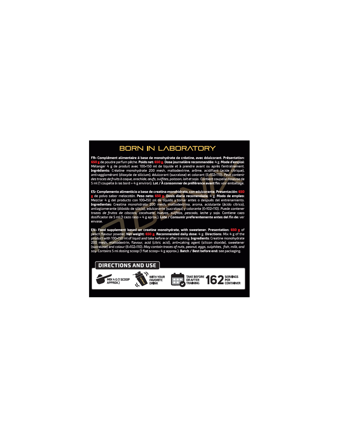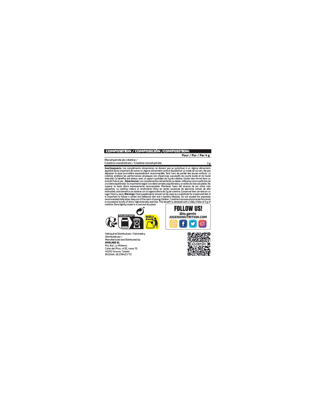 Ingredientes: Creatina monohidrato. Puede contener trazas de gluten (trigo y avena), huevos, leche, pescado y soja. Contiene cazo dosificador de 5 ml (1 cazo raso = 3 g). Lote / Consumir preferentemente antes del fin de: ver envase.
