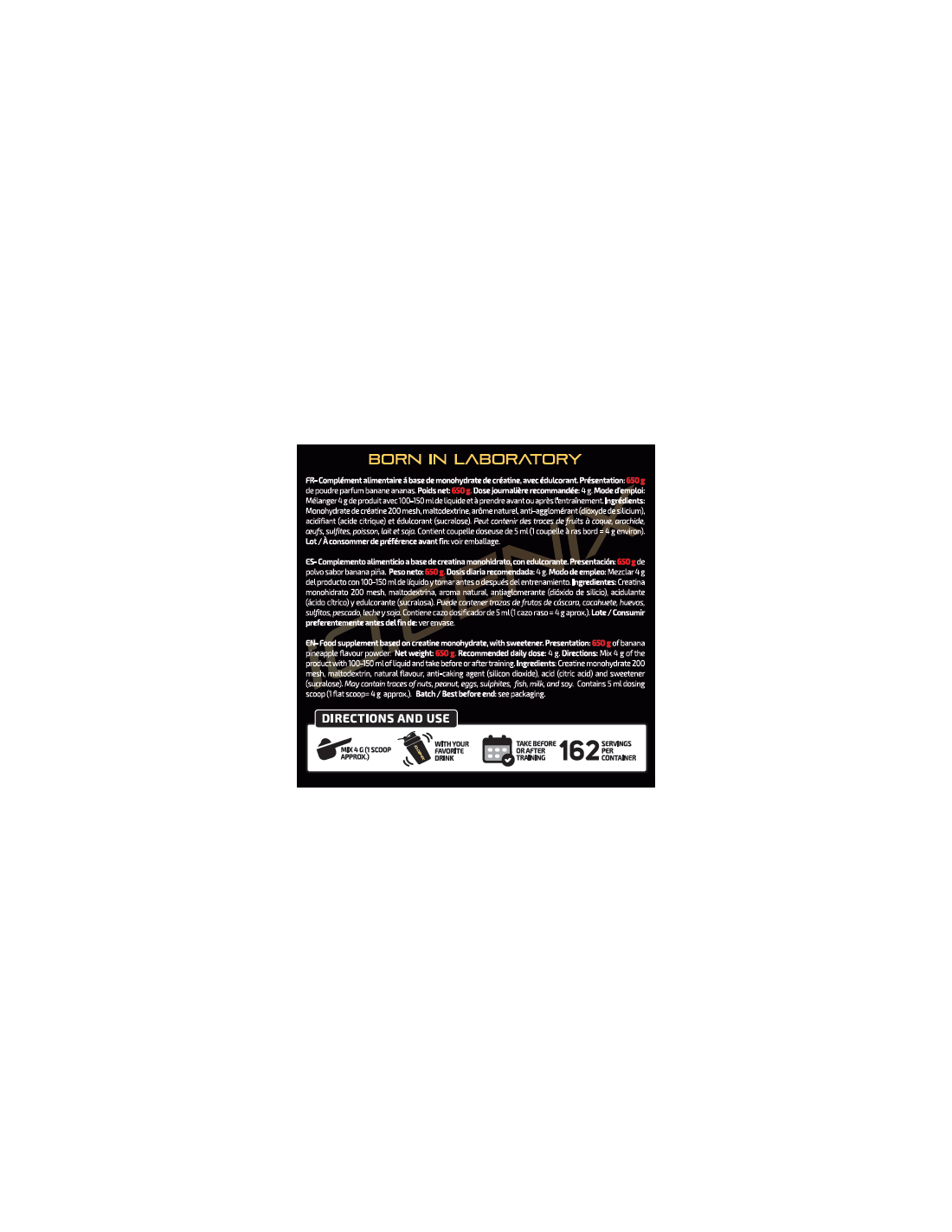 Ingredientes: Creatina monohidrato. Puede contener trazas de gluten (trigo y avena), huevos, leche, pescado y soja. Contiene cazo dosificador de 5 ml (1 cazo raso = 3 g). Lote / Consumir preferentemente antes del fin de: ver envase.