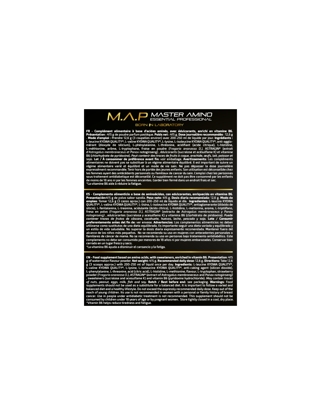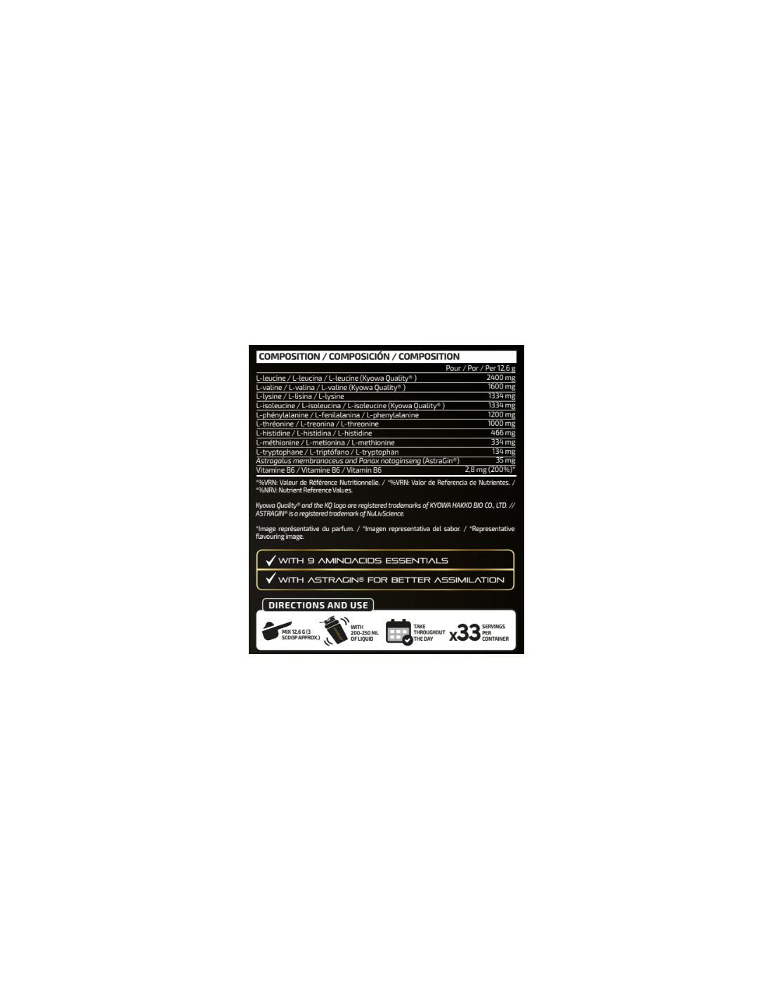 Ingredientes: L-leucina Kyowa Quality®, L-valina Kyowa Quality®, L-lisina, L-isoleucina Kyowa Quality®, L-fenilalanina, acidulante (ácido cítrico), antiaglomerante (dióxido de silicio), L-treonina, L-histidina, aroma, L-metionina, L-triptófano, Astragin ® (extracto de Astragalus membranaceus y extracto de Panax notoginseng), edulcorantes (sucralosa y acesulfamo K) y vitamina B6 (clorhidrato de piridoxina). Puede contener trazas de gluten (trigo y avena), huevos, leche, pescado y soja. Lote / Consumir preferentemente antes del fin de: ver envase.