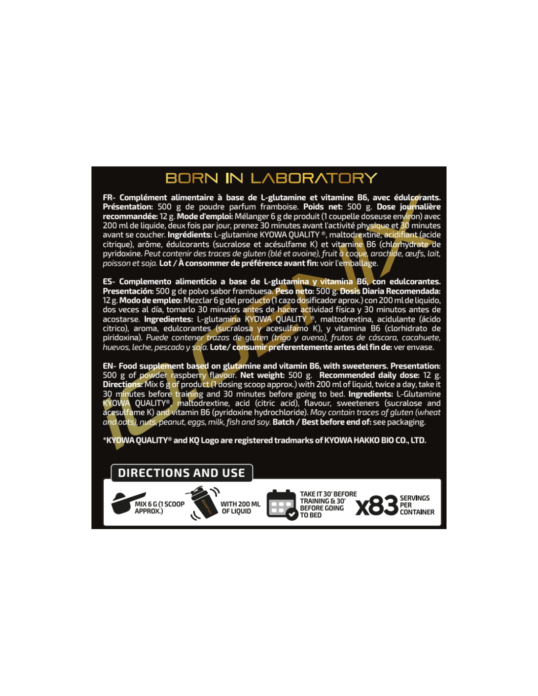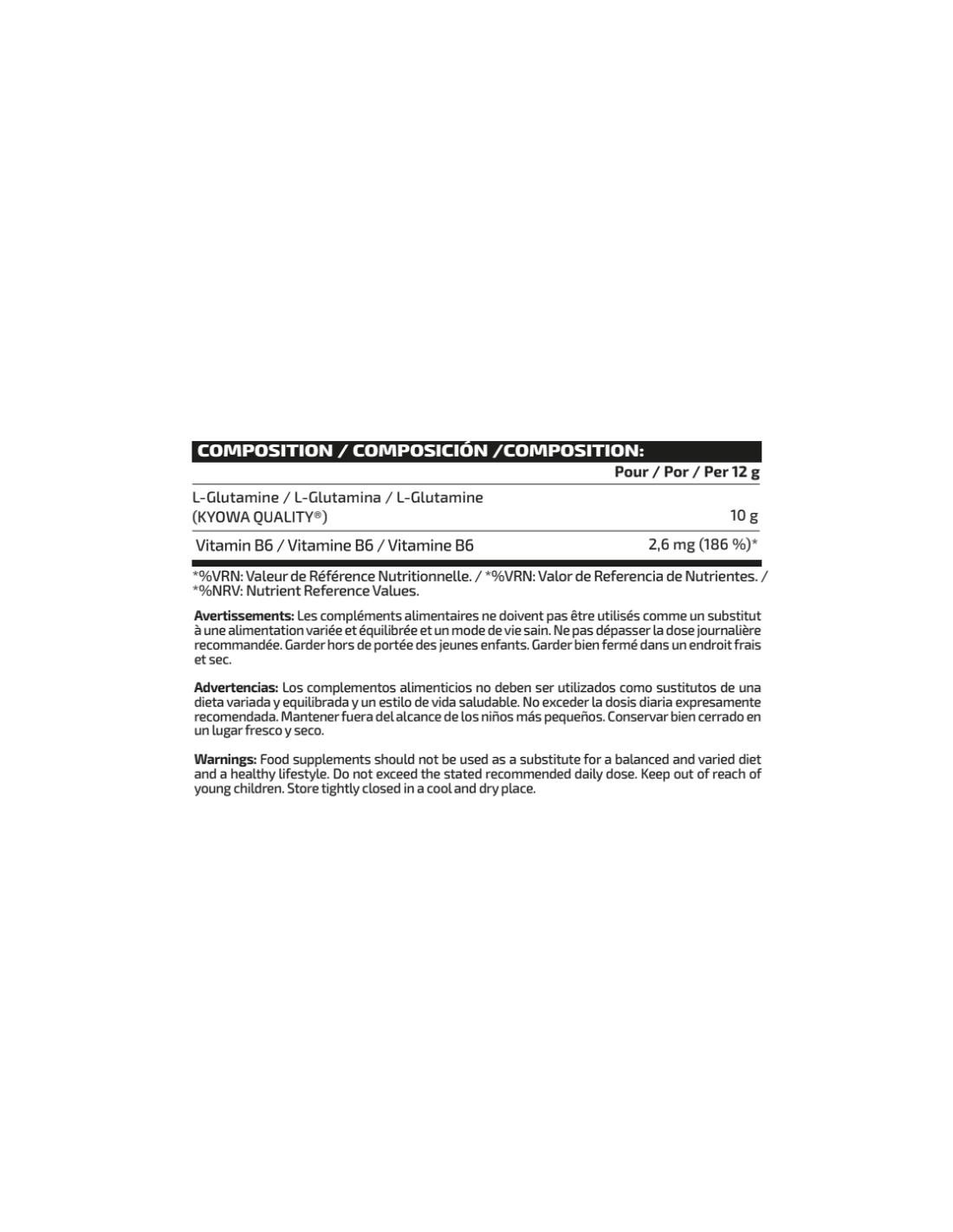 Ingredientes: L-glutamina Kyowa Quality®, maltodextrina, acidulante (ácido cítrico), aroma, edulcorantes (sucralosa y acesulfamo K) y vitamina B6 (clorhidrato de piridoxina). Puede contener trazas de gluten (trigo y avena), huevos, leche, pescado y soja.