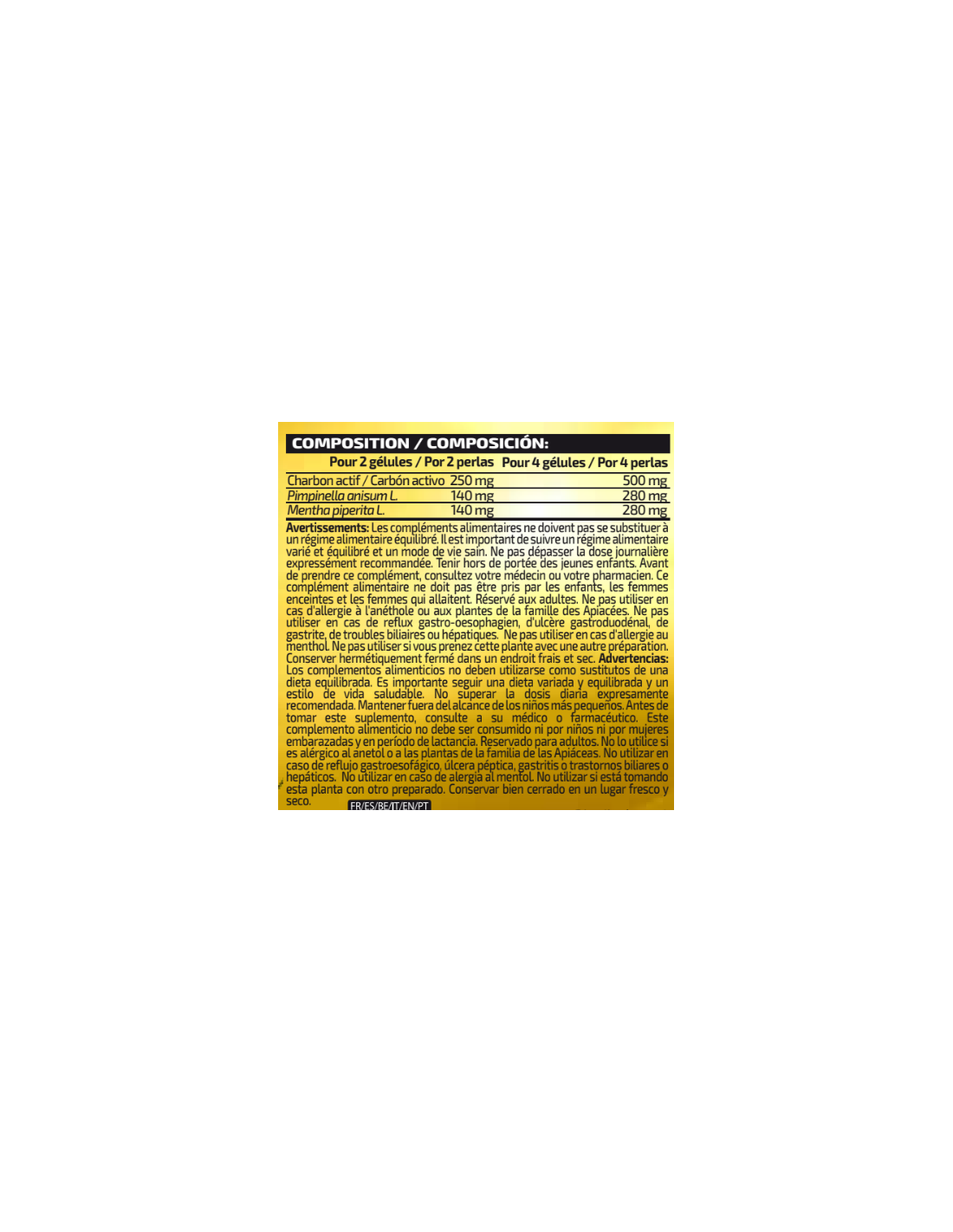 Ingredientes: Agente de carga (aceite de girasol refinado), agente de recubrimiento (gelatina y humectante (glicerina)), carbón activado, aceite esencial de anís verde (Pimpinella anisum L.), aceite esencial de menta (Mentha piperita L.), emulgente (lecitina de soja), estabilizante (grasa de soja parcialmente hidrogenada) y espesantes (silice coloidal, cera de abeja y grasa de soja hidrogenada). Puede contener trazas de gluten, huevos, leche y pescado.