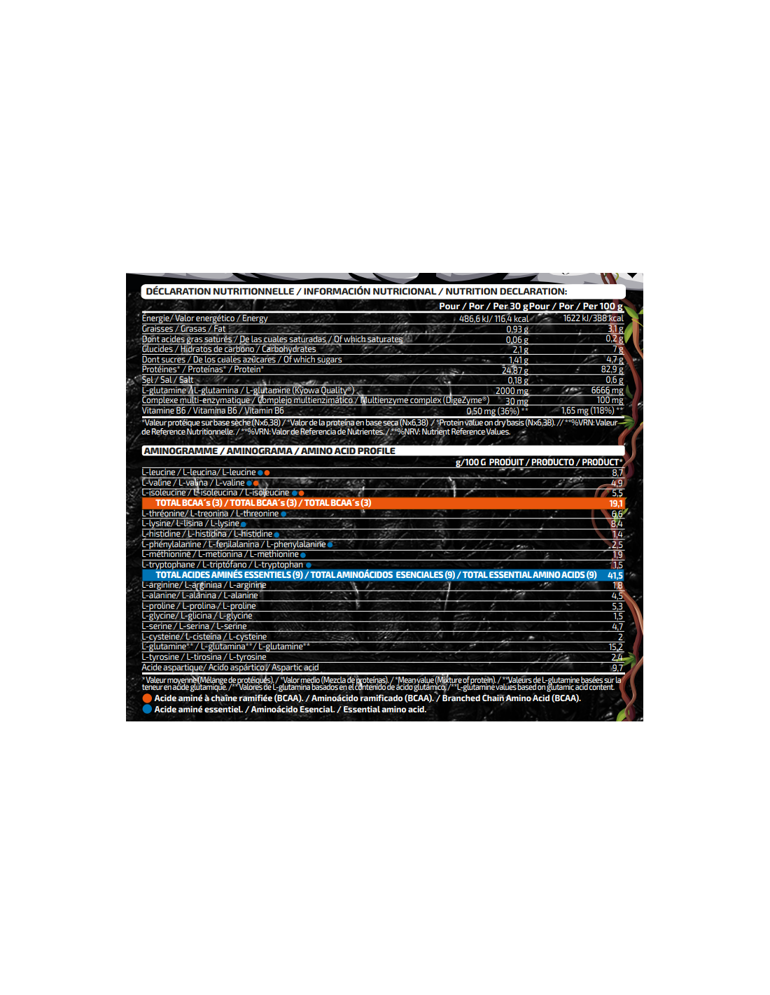 Incluye una cantidad significativa de este aminoácido, que va a ayudar a la síntesis de proteínas. Además, pertenece a la patente Kyowa Quality®, una de las patentes más reconocidas en cuanto a aminoácidos se refiere, gracias a la calidad que presenta tanto en el proceso de producción como en el producto final.