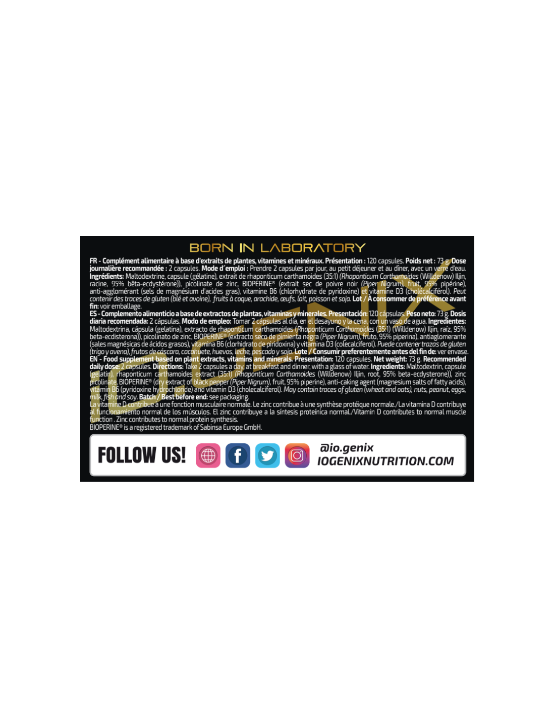 Ingredientes: Maltodextrina, agentes de recubrimiento (gelatina), extracto de rhaponticum carthamoides (Rhaponticum carthamoides (Willdenow) Iljin, raíz, 95% beta-ecdisterona)), picolinato de zinc, Bioperine® (extracto seco de pimienta negra (35:1) (Piper nigrum), fruto, 95% piperina), antiaglomerante (estearato de magnesio), vitamina B6 (clorhidrato de piridoxina) y vitamina D (colecalciferol). Puede contener trazas de gluten (trigo y avena), huevos, leche, pescado y soja.