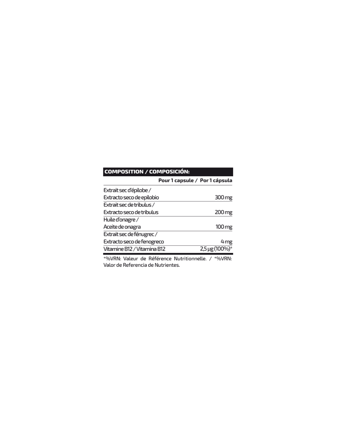 Ingredientes: Extracto seco de parte aérea de epilobio (Epilobium parviflorum Schreb.), extracto seco de fruto de tribulus (Tribulus terrestris L.), cápsula (gelatina), antiaglomerante (sales magnésicas de ácidos grasos), aceite de onagra en polvo (Oenothera biennis L.), extracto seco de semillas de fenogreco (Trigonella foenum-graecum L.) y cianocobalamina (vitamina B12).Puede contener trazas de gluten (trigo y avena), frutos de cáscara, cacahuete, huevos, leche, sulfitos, pescado y soja. Lote / Consumir preferentemente antes del fin de: ver envase. Advertencias: Los complementos alimenticios no deben utilizarse como sustitutos de una dieta equilibrada. Es importante seguir una dieta variada y equilibrada y un estilo de vida saludable. No superar la dosis diaria expresamente recomendada. Mantener fuera del alcance de los niños más pequeños. No utilizar en caso de embarazo o lactancia. Consulte con su médico o farmacéutico si está tomando medicamentos para la hipertensión o la diabetes. No utilizar en niños ni adolescentes menores de 21 años. Conservar bien cerrado en un lugar fresco y seco.