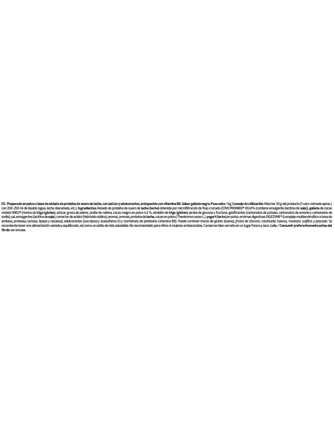 Preparado en polvo a base de aislado de proteína de suero de leche, con edulcorantes, enriquecido con vitamina B6. Peso neto: 1 kg. Consejo de utilización: Mezclar 30 g del producto (1 cazo colmado aprox.) con 200-250 ml de líquido (agua, leche desnatada, etc.). Ingredientes: Aislado de proteína de suero de leche (leche) obtenida por microfiltración de flujo cruzado (CFM) PROMIKO® 89,71% (contiene emulgente (lecitina de soja)), proteína de leche, aroma, edulcorantes (sucralosa y acesulfamo K), enzimas digestivas DIGEZYME® (complejo multienzimático a base de amilasa, proteasa, lactasa, lipasa y celulasa) y vitamina B6 (clorhidrato de piridoxina). Puede contener trazas de frutos de cáscara, cacahuete, huevos y pescado. No recomendado para niños ni mujeres embarazadas. Conservar bien cerrado en un lugar fresco y seco. Lote / Consumir preferentemente antes del fin de: ver envase
