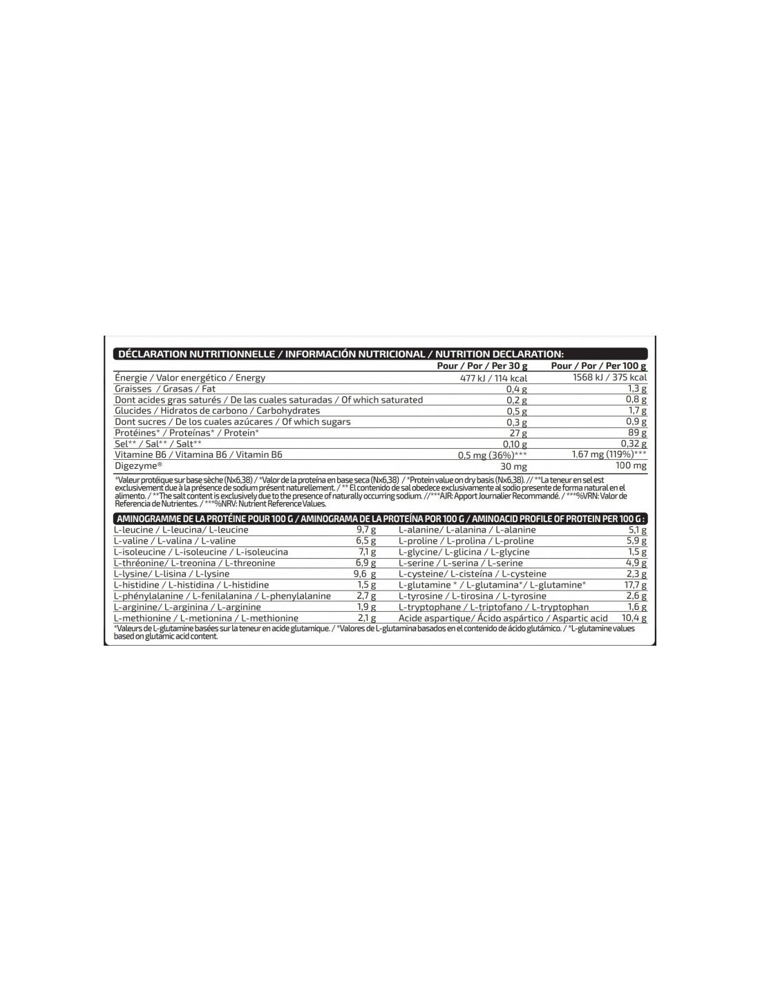 Se trata de un aislado de proteína que utiliza una materia prima única como es Isolac® por su cantidad de proteína pura total después de haberse extraído por la mejor técnica de la actualidad, microfiltración de flujo cruzado (CFM) preservando la calidad de la proteína y un excelente perfil de aminoácidos. Además, hemos añadido el complejo de enzimas digestivas Digezime® y vitamina B6