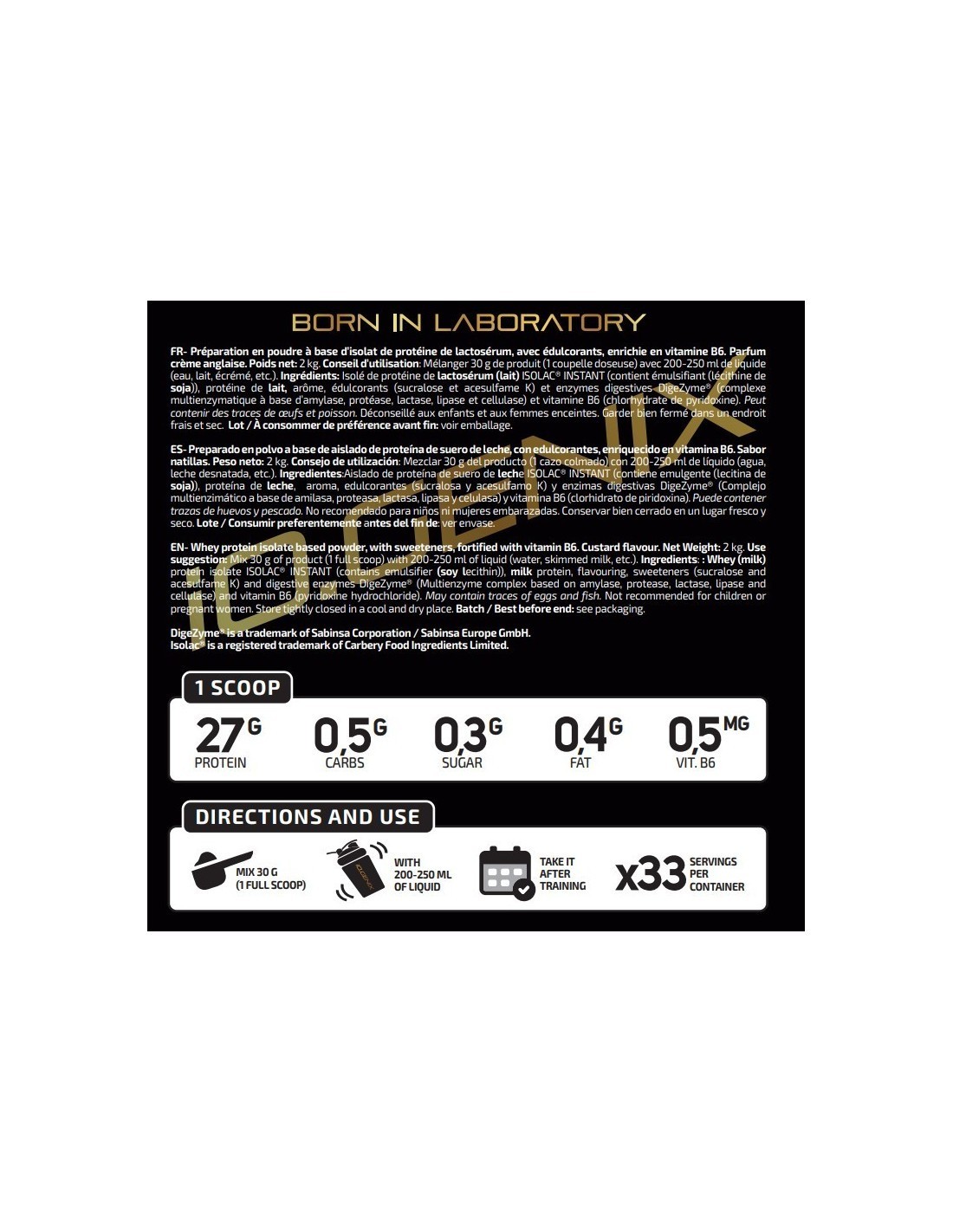 Ingredientes: Aislado de proteína de suero de leche ISOLAC® INSTANT (contiene emulgente (lecitina de soja)), proteína de leche, aromas (leche), edulcorantes (sucralosa y acesulfamo K) y enzimas digestivas DigeZyme® (complejo multienzimático a base de amilasa, proteasa, lactasa, lipasa y celulasa) y vitamina B6 (clorhidrato de piridoxina). Puede contener trazas de huevos y pescado. No recomendado para niños ni mujeres embarazadas. Conservar bien cerrado en un lugar fresco y seco.