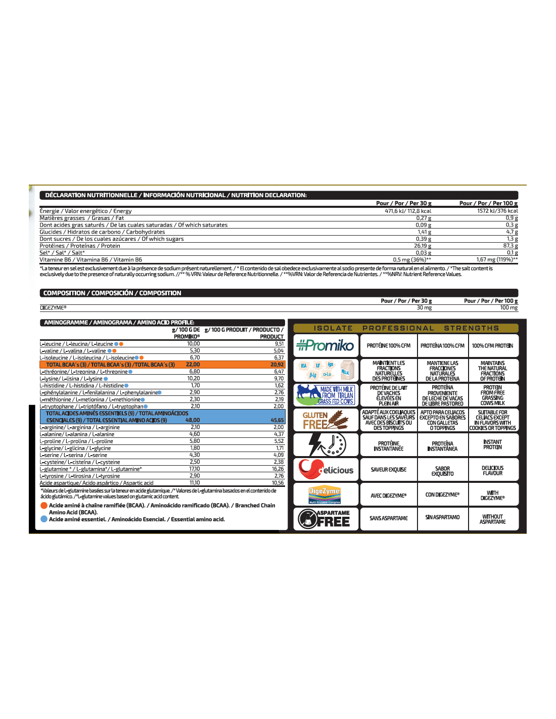 Ingredientes: Aislado de proteína de suero de leche ISOLAC® INSTANT (contiene emulgente (lecitina de soja)), proteína de leche, aromas (leche), edulcorantes (sucralosa y acesulfamo K) y enzimas digestivas DigeZyme® (complejo multienzimático a base de amilasa, proteasa, lactasa, lipasa y celulasa) y vitamina B6 (clorhidrato de piridoxina). Puede contener trazas de huevos y pescado. No recomendado para niños ni mujeres embarazadas. Conservar bien cerrado en un lugar fresco y seco.