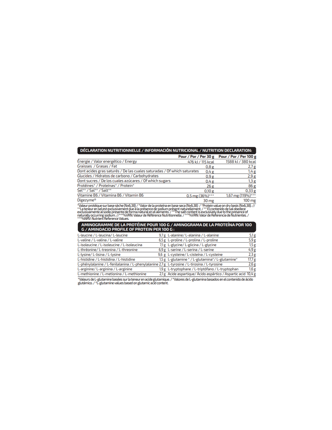 Se trata de un aislado de proteína que utiliza una materia prima única como es Isolac® por su cantidad de proteína pura total después de haberse extraído por la mejor técnica de la actualidad, microfiltración de flujo cruzado (CFM) preservando la calidad de la proteína y un excelente perfil de aminoácidos. Además, hemos añadido el complejo de enzimas digestivas Digezime® y vitamina B6