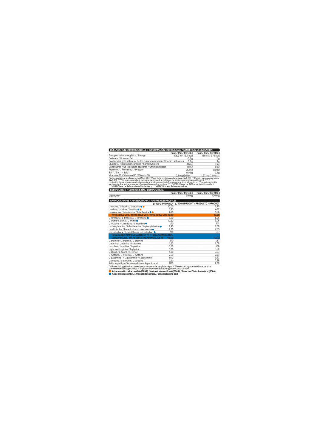 Ingredientes: Aislado de proteína de suero de leche ISOLAC® INSTANT (contiene emulgente (lecitina de soja)), proteína de leche, aromas (leche), edulcorantes (sucralosa y acesulfamo K) y enzimas digestivas DigeZyme® (complejo multienzimático a base de amilasa, proteasa, lactasa, lipasa y celulasa) y vitamina B6 (clorhidrato de piridoxina). Puede contener trazas de huevos y pescado. No recomendado para niños ni mujeres embarazadas. Conservar bien cerrado en un lugar fresco y seco.