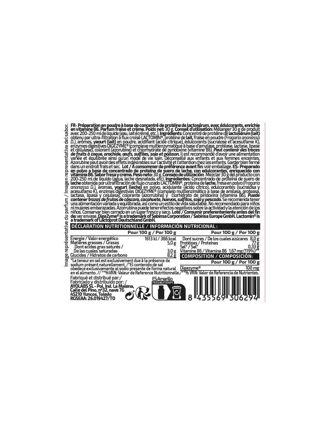 Preparado en polvo a base de concentrado de proteína de suero de leche, con edulcorantes sabor con trocitos contiene azucar), enriquecido con vitamina B6. Sabor chocolate. Peso neto: 30 g. Consejo de utilización: Mezclar 30 g del producto (1 cazo colmado aprox.) con 200-250 ml de líquido (agua, leche desnatada, etc). Ingredientes: Concentrado de proteína de suero de leche obtenida por ultrafiltración de flujo cruzado (LACTOMIN®), proteína de leche, aroma, edulcorantes (sucralosa y acesulfamo K), enzimas digestivas DigeZyme® (complejo multienzimático a base de amilasa, proteasa, lactasa, lipasa y celulasa) y vitamina B6 (clorhidrato de piridoxina). Puede contener trazas de huevos, soja y pescado. No recomendado para niños ni mujeres embarazadas. Conservar bien cerrado en un lugar fresco y seco. Lote / Consumir preferentemente antes del fin de: ver envase.