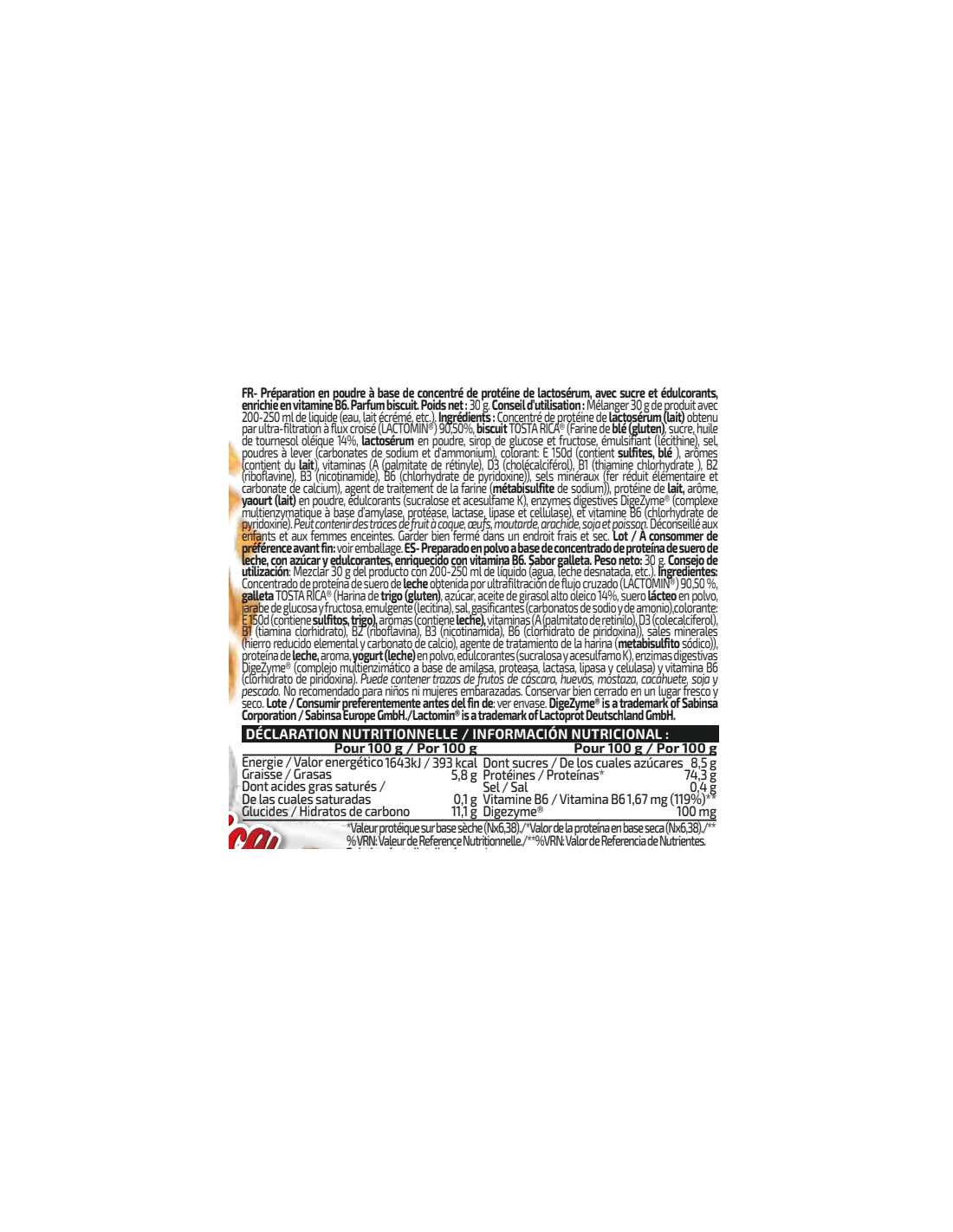 Preparado en polvo a base de concentrado de proteína de suero de leche, con edulcorantes sabor con trocitos contiene azucar), enriquecido con vitamina B6. Sabor chocolate. Peso neto: 30 g. Consejo de utilización: Mezclar 30 g del producto (1 cazo colmado aprox.) con 200-250 ml de líquido (agua, leche desnatada, etc). Ingredientes: Concentrado de proteína de suero de leche obtenida por ultrafiltración de flujo cruzado (LACTOMIN®), proteína de leche, aroma, edulcorantes (sucralosa y acesulfamo K), enzimas digestivas DigeZyme® (complejo multienzimático a base de amilasa, proteasa, lactasa, lipasa y celulasa) y vitamina B6 (clorhidrato de piridoxina). Puede contener trazas de huevos, soja y pescado. No recomendado para niños ni mujeres embarazadas. Conservar bien cerrado en un lugar fresco y seco. Lote / Consumir preferentemente antes del fin de: ver envase.