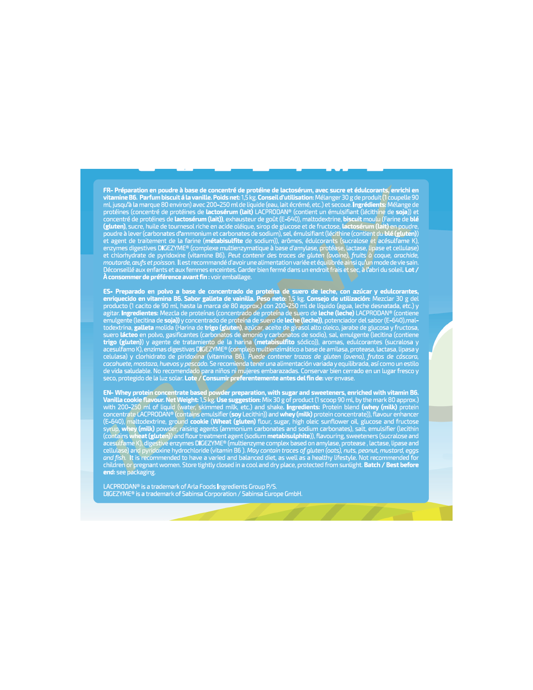 Preparado en polvo a base de concentrado de proteína de suero de leche, con azúcar y edulcorantes, enriquecido en vitamina B6. Sabor chocolate con leche. Peso neto: 1,5 kg. Consejo de utilización: Mezclar 30 g del producto (1 cacito de 90 ml, hasta la marca de 80 aprox.) con 200–250 ml de líquido (agua, leche desnatada, etc.) y agitar. Ingredientes: Mezcla de proteínas (concentrado de proteína de suero de leche (leche) LACPRODAN® (contiene emulgente (lecitina de soja)) y concentrado de proteína de suero de leche (leche)), potenciador del sabor (E-640), maltodextrina, cacao en polvo (Theobroma cacao L.), trocitos planos de chocolate (azúcar, pasta de cacao, manteca de cacao, cacao desgrasado en polvo, emulgente (E-322 lecitina de girasol), jarabe de glucosa y aroma natural), aromas, edulcorantes (sucralosa y acesulfamo K), yogurt (leche) en polvo, enzimas digestivas DIGEZYME® (complejo multienzimático a base de amilasa, proteasa, lactasa, lipasa y celulasa) y clorhidrato de piridoxina (vitamina B6). Puede contener trazas de gluten (trigo y avena), frutos de cáscara, cacahuete, huevos, sulfitos y pescado. Se recomienda tener una alimentación variada y equilibrada, así como un estilo de vida saludable.