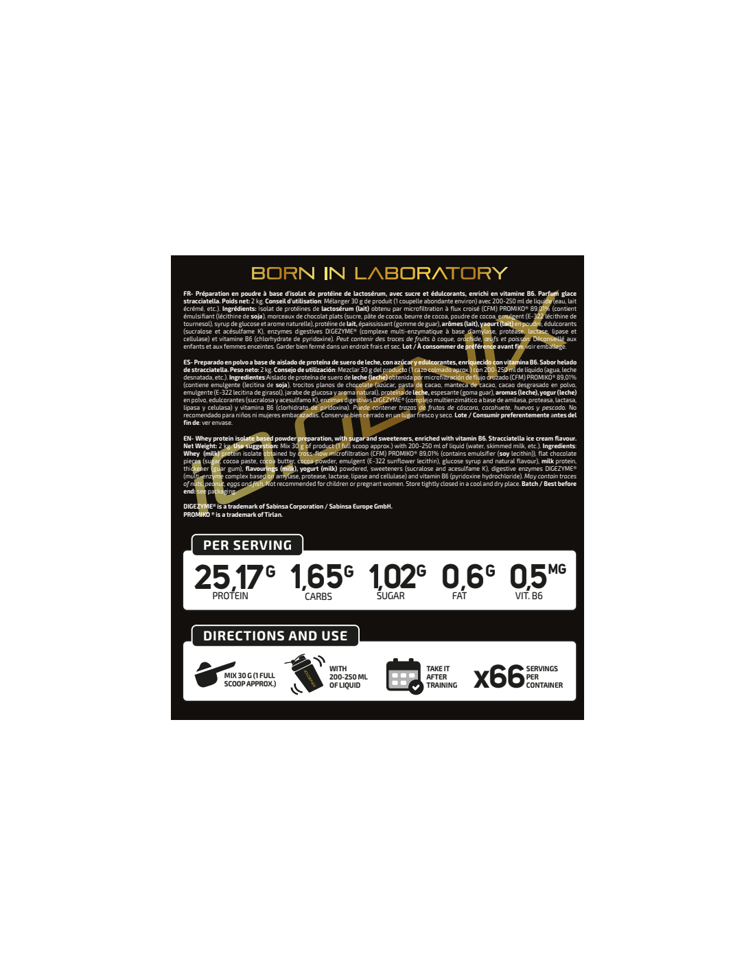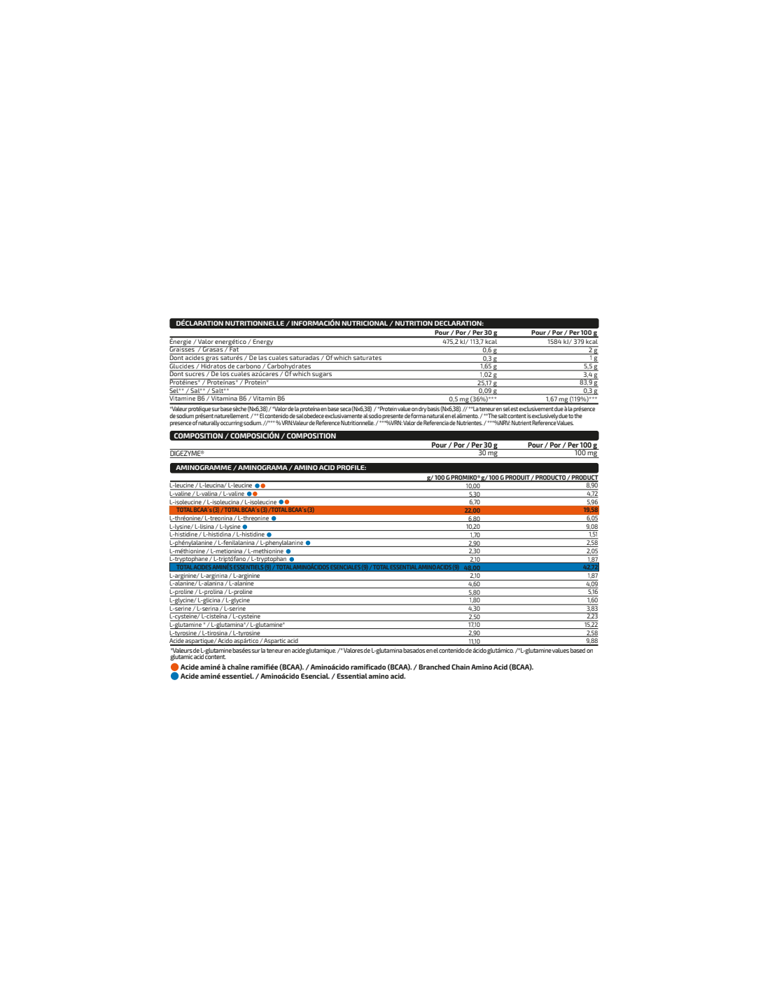 Isolate Professional, se trata de un aislado de proteína que utiliza una materia prima única como es PROMIKO ® por su cantidad de proteína pura total después de haberse extraído por la mejor técnica de la actualidad, microfiltración de flujo cruzado (CFM) preservando la calidad de la proteína y un excelente perfil de aminoácidos. Además, hemos añadido el complejo de enzimas digestivas Digezime® y vitamina B6