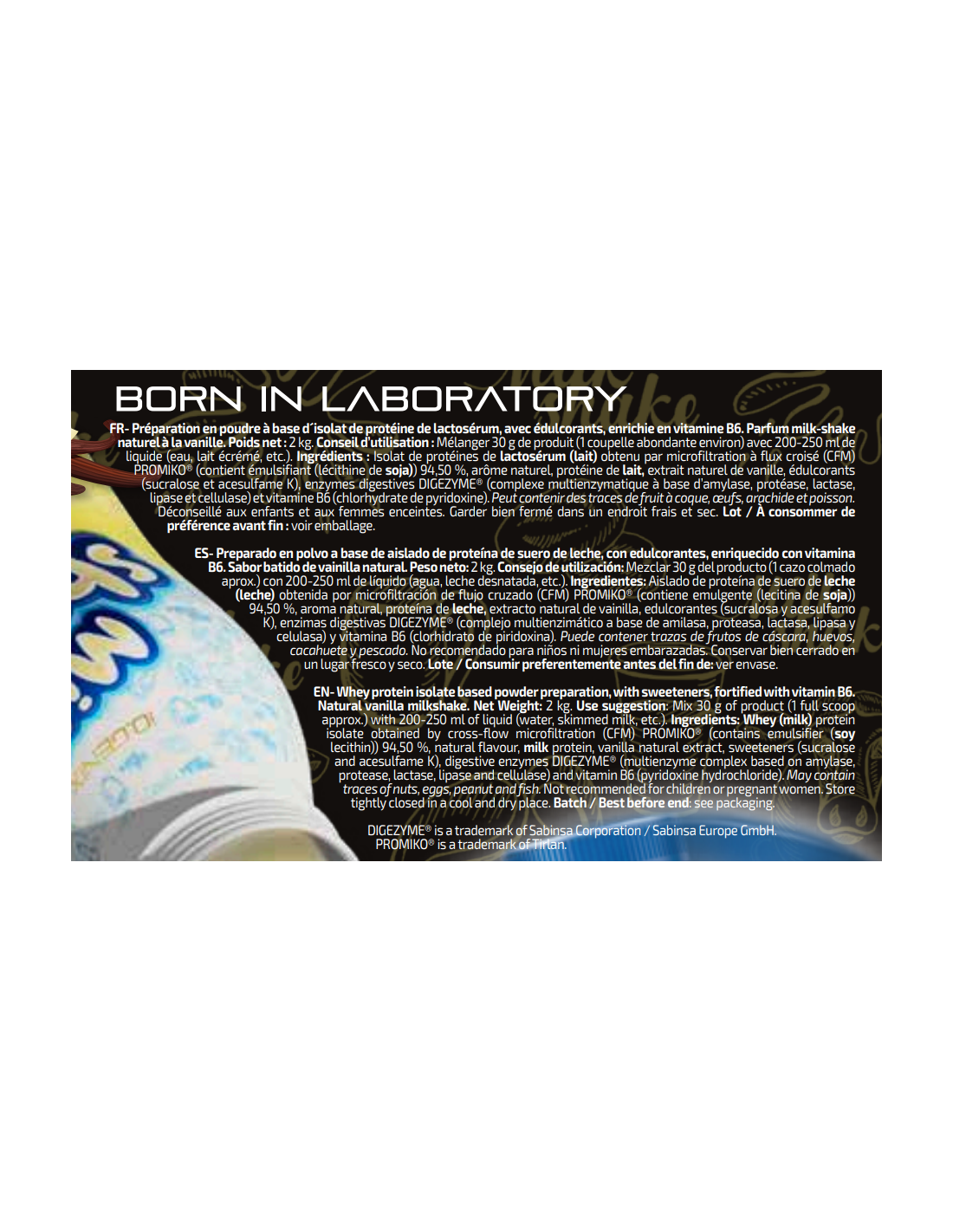 Preparado en polvo a base de aislado de proteína de suero de leche, con edulcorantes, enriquecido con vitamina B6. (Sabor con trocito contiene azucar) Peso neto: 2 kg. Consejo de utilización: Mezclar 30 g del producto (1 cazo colmado aprox.) con 200-250 ml de líquido (agua, leche desnatada, etc.). Ingredientes: Aislado de proteína de suero de leche (leche) obtenida por microfiltración de flujo cruzado (CFM) PROMIKO® 89,71% (contiene emulgente (lecitina de soja)), proteína de leche, aroma, edulcorantes (sucralosa y acesulfamo K), enzimas digestivas DIGEZYME® (complejo multienzimático a base de amilasa, proteasa, lactasa, lipasa y celulasa) y vitamina B6 (clorhidrato de piridoxina). Puede contener trazas de frutos de cáscara, cacahuete, huevos y pescado. No recomendado para niños ni mujeres embarazadas. Conservar bien cerrado en un lugar fresco y seco. Lote / Consumir preferentemente antes del fin de: ver envase