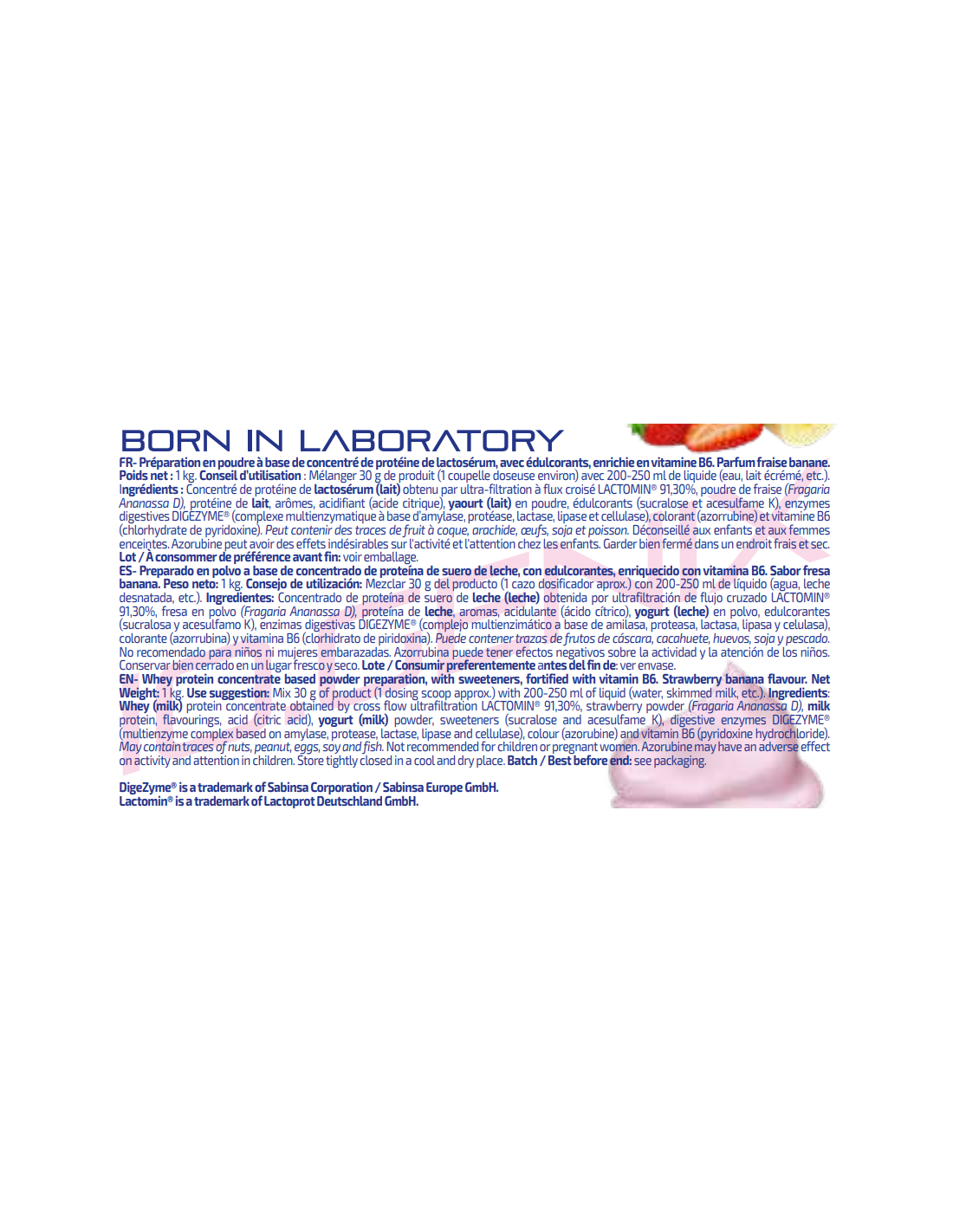 Ingredientes: Concentrado de proteína de suero de leche obtenida por ultrafiltración de flujo cruzado (LACTOMIN®), proteína de leche, aromas (leche), L-leucina, L-isoleucina, L-valina, edulcorantes (sucralosa y acesulfamo K), enzimas digestivas DigeZyme® (complejo multienzimático a base de amilasa, proteasa, lactasa, lipasa y celulasa) y vitamina B6 (clorhidrato de piridoxina). Puede contener trazas de gluten (avena), huevos, soja y pescado. No recomendado para niños ni mujeres embarazadas. Conservar bien cerrado en un lugar fresco y seco.