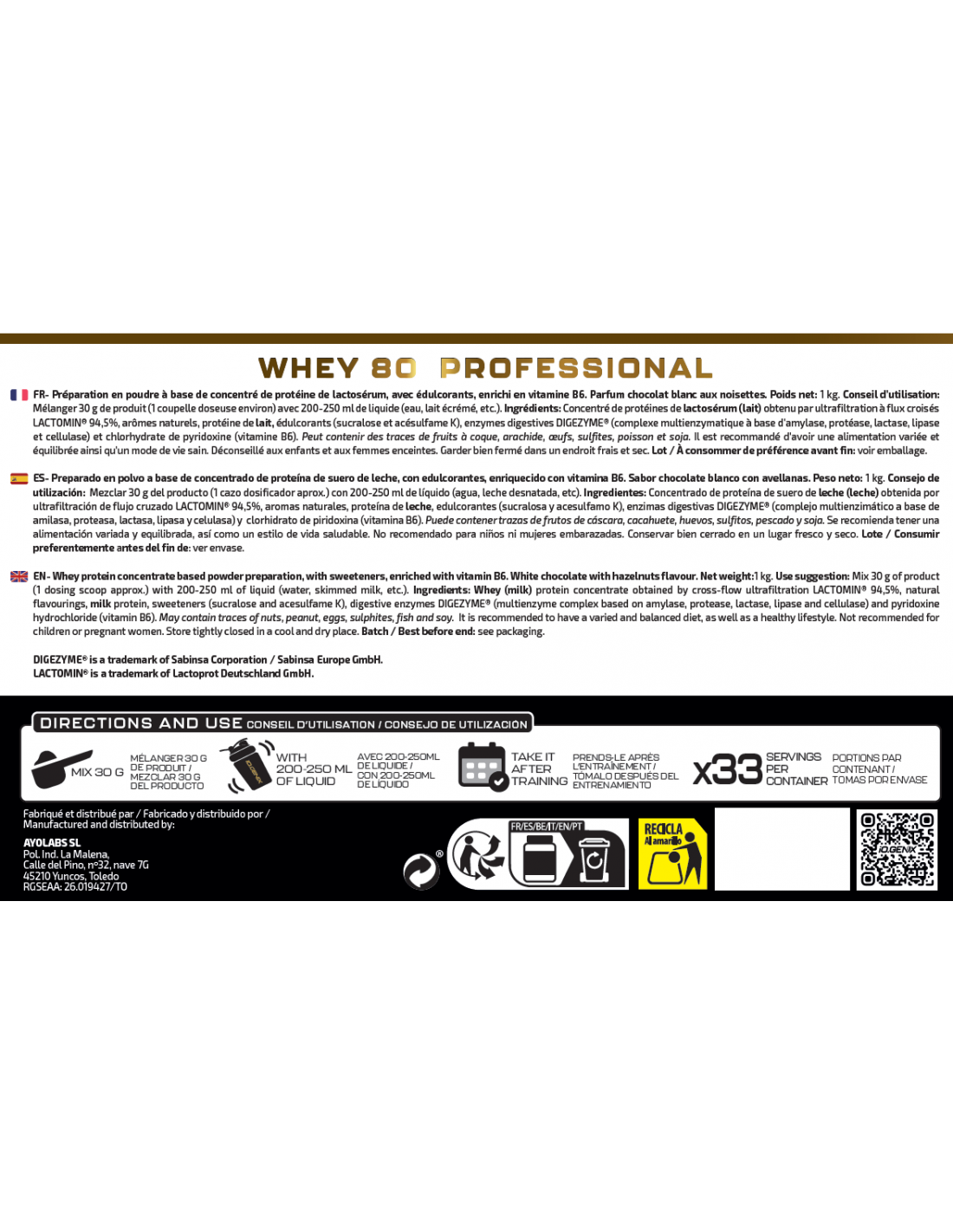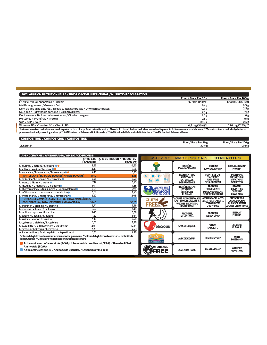 Ingredientes: Concentrado de proteína de suero de leche obtenida por ultrafiltración de flujo cruzado (LACTOMIN®), proteína de leche, aromas (leche), L-leucina, L-isoleucina, L-valina, edulcorantes (sucralosa y acesulfamo K), enzimas digestivas DigeZyme® (complejo multienzimático a base de amilasa, proteasa, lactasa, lipasa y celulasa) y vitamina B6 (clorhidrato de piridoxina). Puede contener trazas de gluten (avena), huevos, soja y pescado. No recomendado para niños ni mujeres embarazadas. Conservar bien cerrado en un lugar fresco y seco.