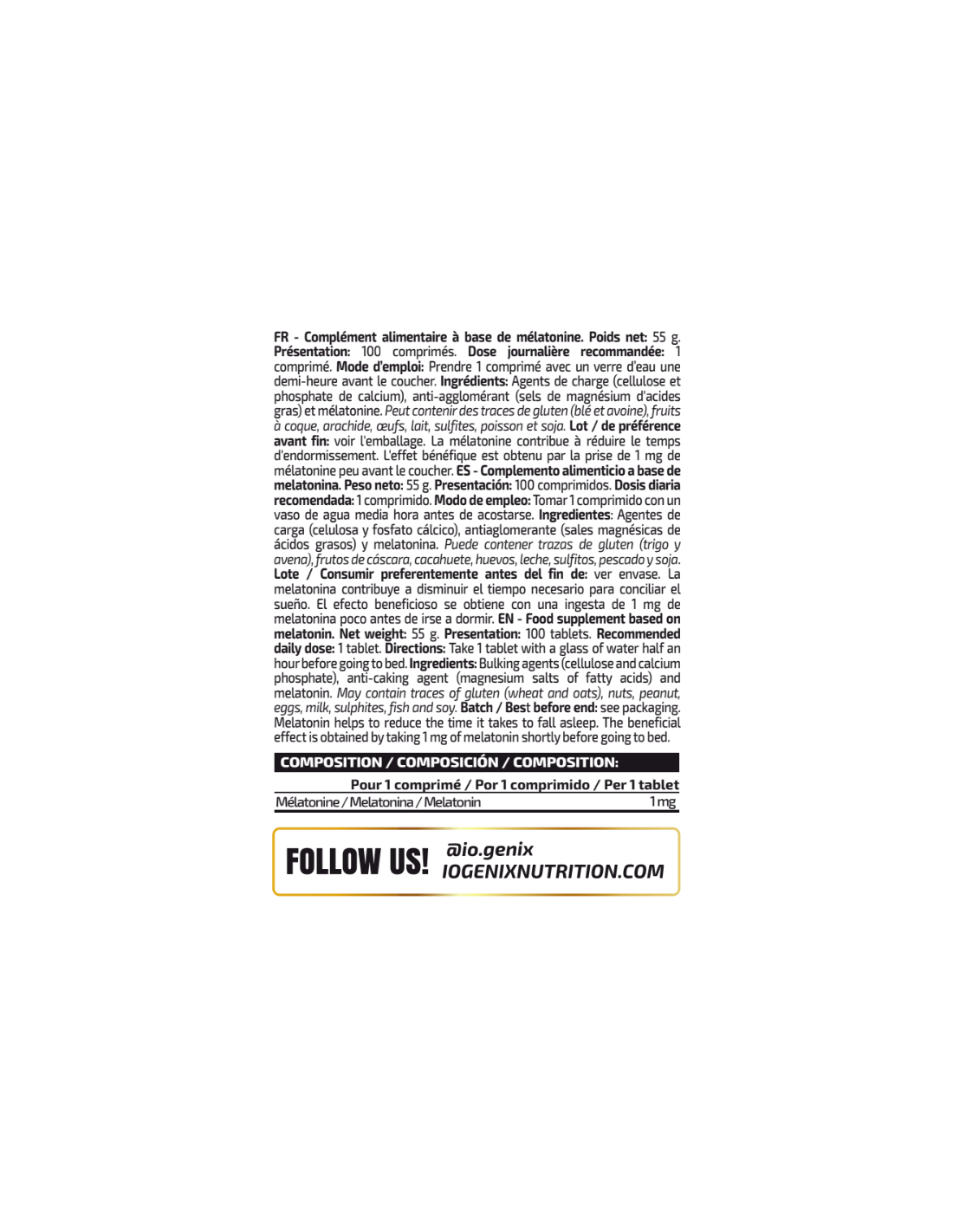 Complemento alimenticio a base de melatonina. Peso neto: 55 g. Presentación: 100 comprimidos. Dosis diaria recomendada: 1 comprimido. Modo de empleo: Tomar 1 comprimido con un vaso de agua media hora antes de acostarse. Ingredientes: Agentes de carga (celulosa y fosfato cálcico), antiaglomerante (sales magnésicas de ácidos grasos) y melatonina. cálcico), antiaglomerante (sales magnésicas de ácidos grasos) y melatonina. Puede contener trazas de gluten (trigo y avena), frutos de cáscara, cacahuete, huevos, leche, sulfitos, pescado y soja. Lote / Consumir preferentemente antes del fin de: ver envase. Advertencias: Los complementos alimenticios no deben ser utilizados como sustitutos de una dieta variada y equilibrada y un estilo de vida saludable. No exceder la dosis diaria expresamente recomendada. Mantener fuera del alcance de los niños más pequeños. No utilizar en niños menores de 18 años y en mujeres embarazadas o en período de lactancia. No utilizar en personas que padezcan enfermedades inflamatorias o autoinmunes, en personas que tienen que realizar una actividad que requiere vigilancia sostenida donde la somnolencia podría suponer un problema de seguridad y/o en personas epilépticas, asmáticas o que padecen trastornos del estado de ánimo, del comportamiento o de la personalidad. Conservar bien cerrado en un lugar fresco y seco