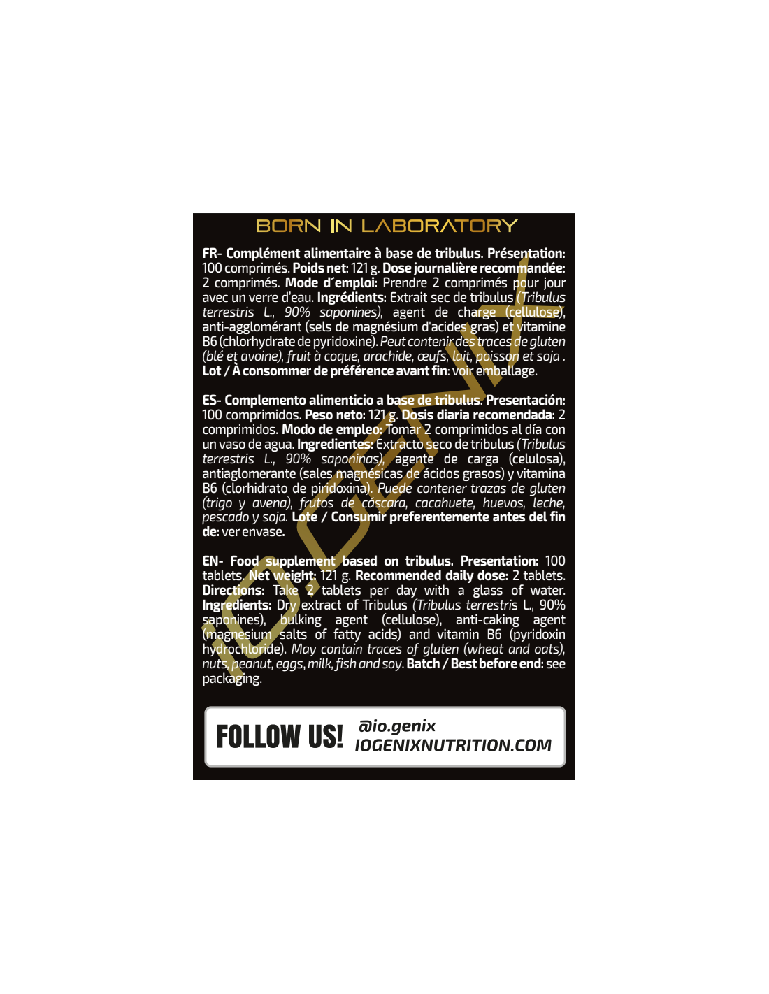 Ingredientes: Extracto seco de tribulus (Tribulus terrestris L., 90% saponinas), agente de carga (celulosa microcristalina), antiaglomerante (estearato de magnesio) y vitamina B6 (clorhidrato de piridoxina). Puede contener trazas de gluten, huevos, leche, pescado y soja.