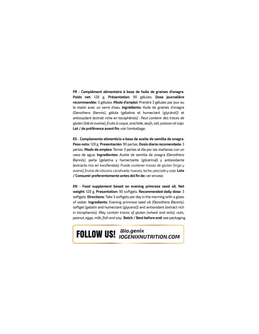 Ingredientes: Aceite de semilla de onagra (Oenothera Biennis), agentes de recubrimiento (gelatina, glicerina y agua). Puede contener trazas de gluten, huevos, leche, pescado y soja.