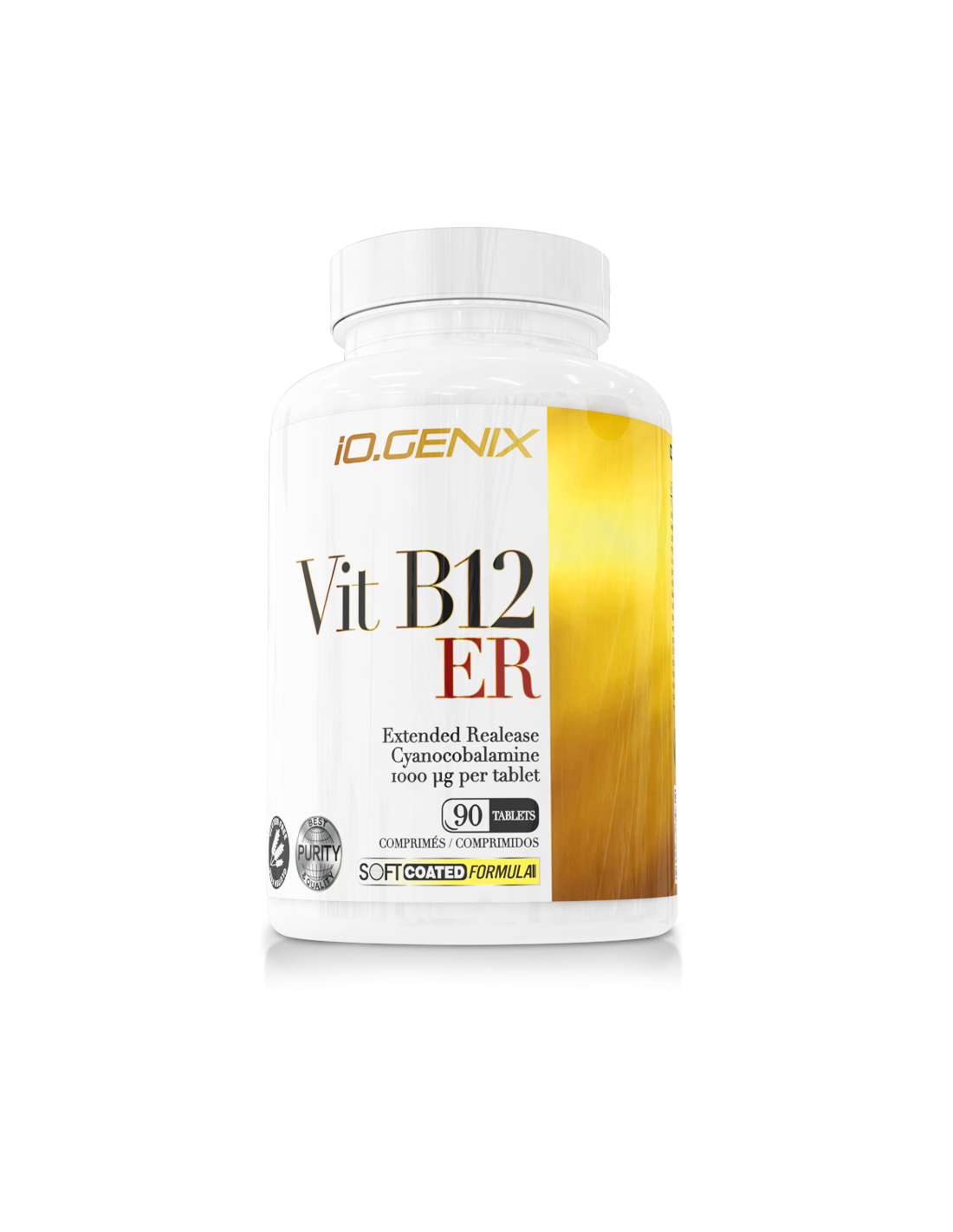 Vit B12 ER 1000 µg de iO.GENIX es un complemento alimenticio en formato comprimido, elaborado a base de cianocobalamina, una de las formas más empleadas de vitamina B12. Formulado con tecnología de liberación prolongada (Extended Release) y recubrimiento soft-coated, permite una administración cómoda, estable, fácilmente ingerible y ajustada a las necesidades diarias de este micronutriente esencial.