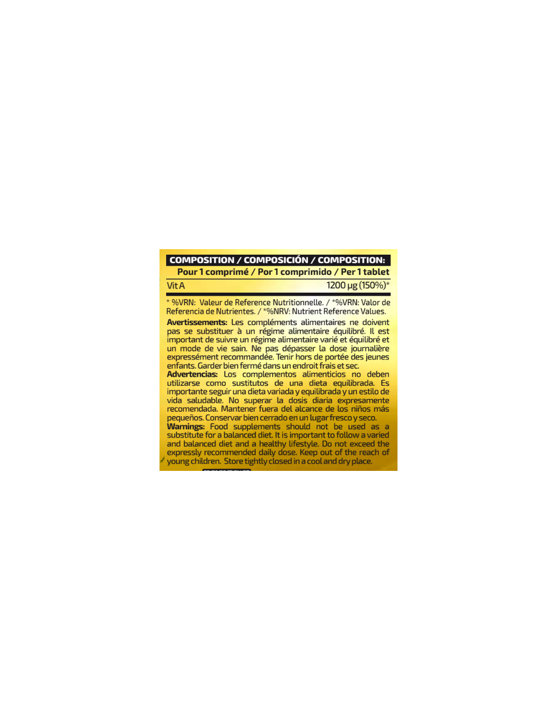 Complemento alimenticio a base de vitaminas. Peso neto: 30 g. Presentación: 60 comprimidos. Dosis diaria recomendada: 1 comprimido. Modo de empleo: Tomar 1 comprimido al día con un vaso de agua. Ingredientes: Agente de carga (celulosa microcristalina), vitamina A (acetato de retinol) y antiaglomerantes (estearato de magnesio y dióxido de silicio). antiaglomerantes (sales magnésicas de ácidos grasos ydióxido de silicio).Puede contener trazas de gluten (trigo y avena), frutos de cáscara, cacahuete, huevos, leche, sulfitos, pescado y soja. Lote / Consumir preferentemente antes del fin de: ver envase. Advertencias: Los complementos alimenticios no deben ser utilizados como sustitutos de una dieta variada y equilibrada y un estilo de vida saludable. No exceder la dosis diaria expresamente recomendada. Mantener fuera del alcance de los niños más pequeños. Conservar bien cerrado en un lugar fresco y seco