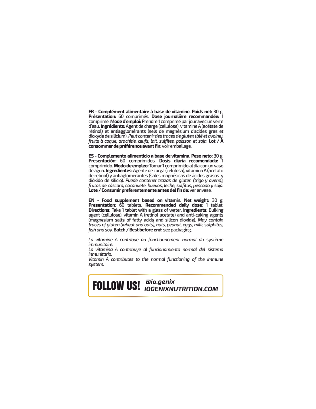 Ingredientes: Agente de carga (celulosa microcristalina), vitamina A (acetato de retinol) y antiaglomerantes (estearato de magnesio y dióxido de silicio). Puede contener trazas de gluten, huevos, leche, pescado y soja.